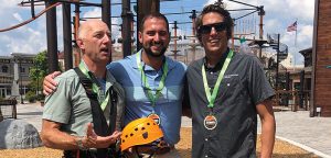 Nick Thompson of CLIMB Works hosted Summer Ops Camp attendees at Paula Deen’s Lumberjack Feud, home to the new Switchback rail-to-cable rollercoaster ride, as well as an aerial adventure park and pro lumberjack show. Left to right: Erik Marter, Synergo; Cameron Annas, Granite Insurance; Nick Thompson, CLIMB Works.