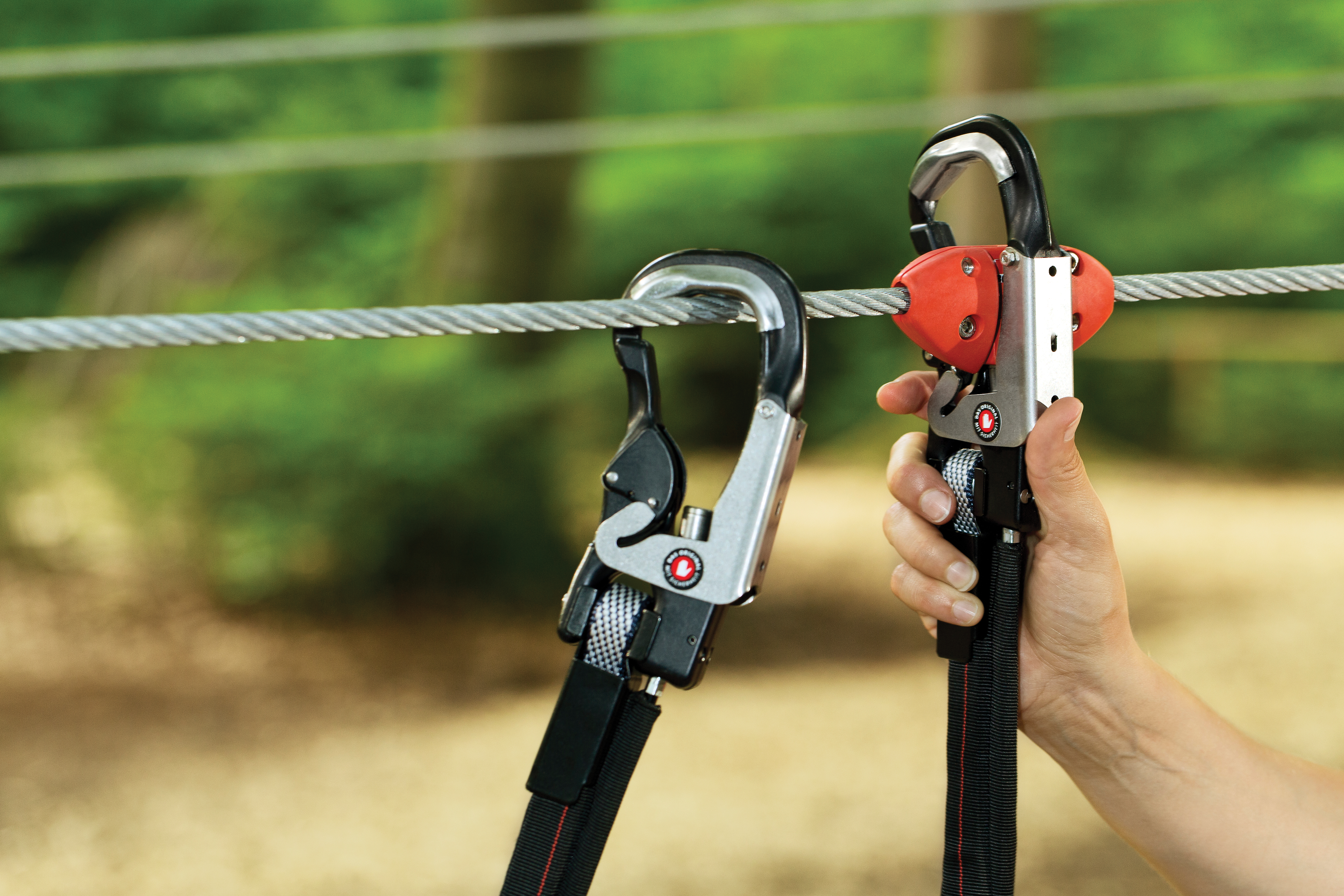 Devices called tweezles (above, red) lock and unlock the carabiners on the Bornack Safe Link SSB smart belay system, allowing guests to only attach to the lifeline and not to staff shortcuts or guy wires, improving safety and keeping guests on track.